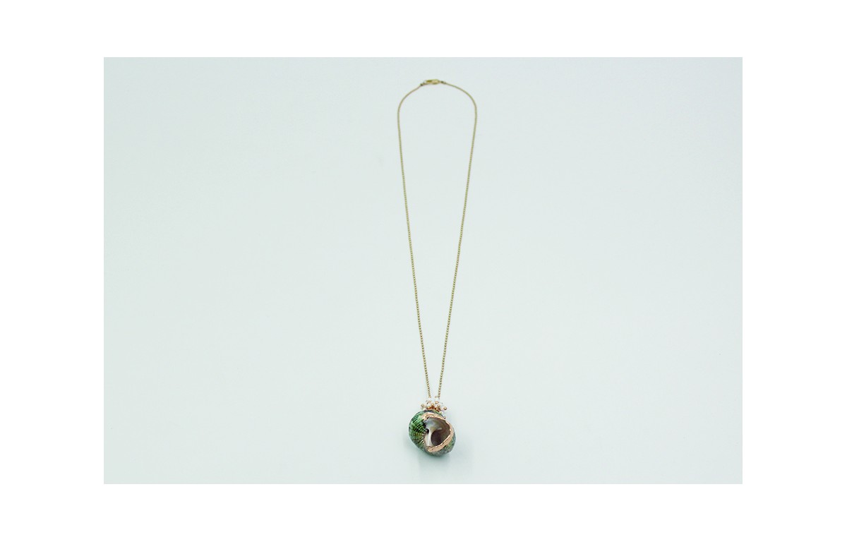 Collar de cadena de bolitas oro mate y colgante de caracola verde. Largo de cadena y colgante 50cm