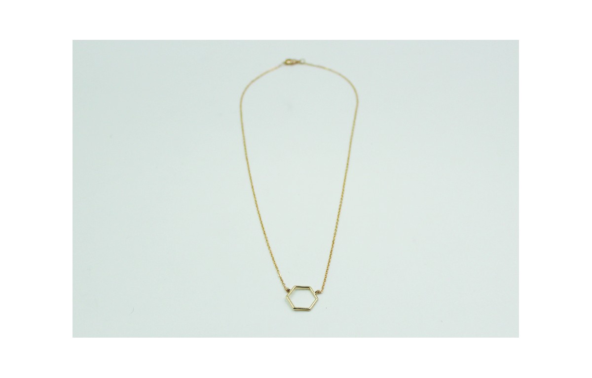 Solitario con hexágono en latón y cadena de eslabón pequeño en acero inoxidable dorada. Largo del collar 41cm.