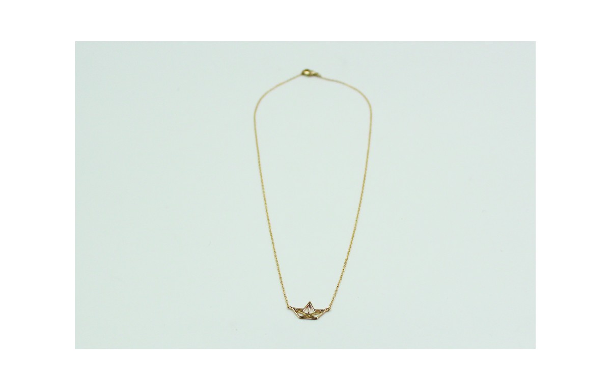 Solitario barco en latón y cadena de eslabón pequeño en acero inoxidable dorada. Largo del collar 40cm.
