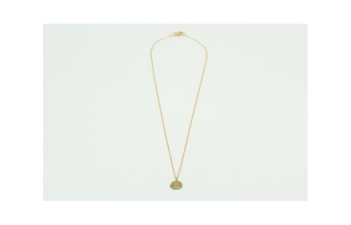 Solitario con cadena de eslabón pequeño dorado y colgante de concha dorada todo en acero inoxidable. Largo del collar 41cm.