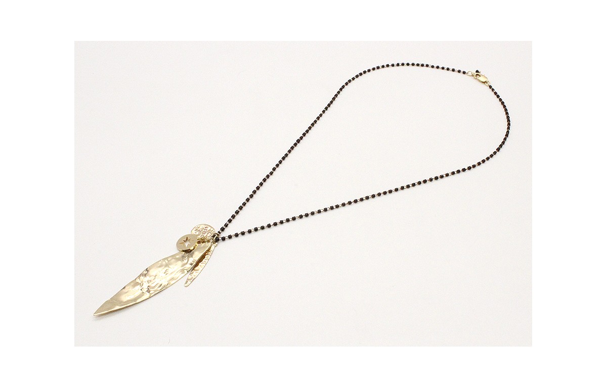 Colgante con cadena de miyuki negro con colgantes en color oro brillo y brillos cristal. Largo 29cm