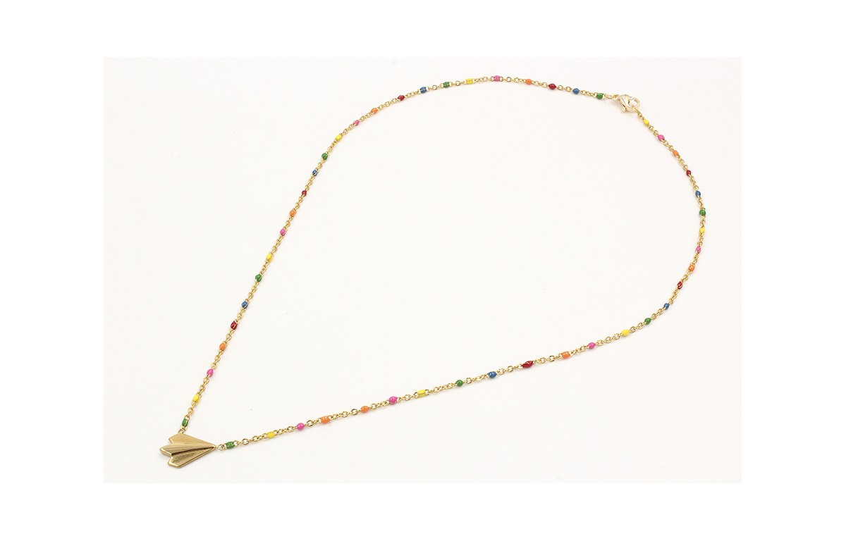 Collar cadena de acero inoxidable de bolitas esmaltadas de colores y colgante de avión. Largo 40cm
