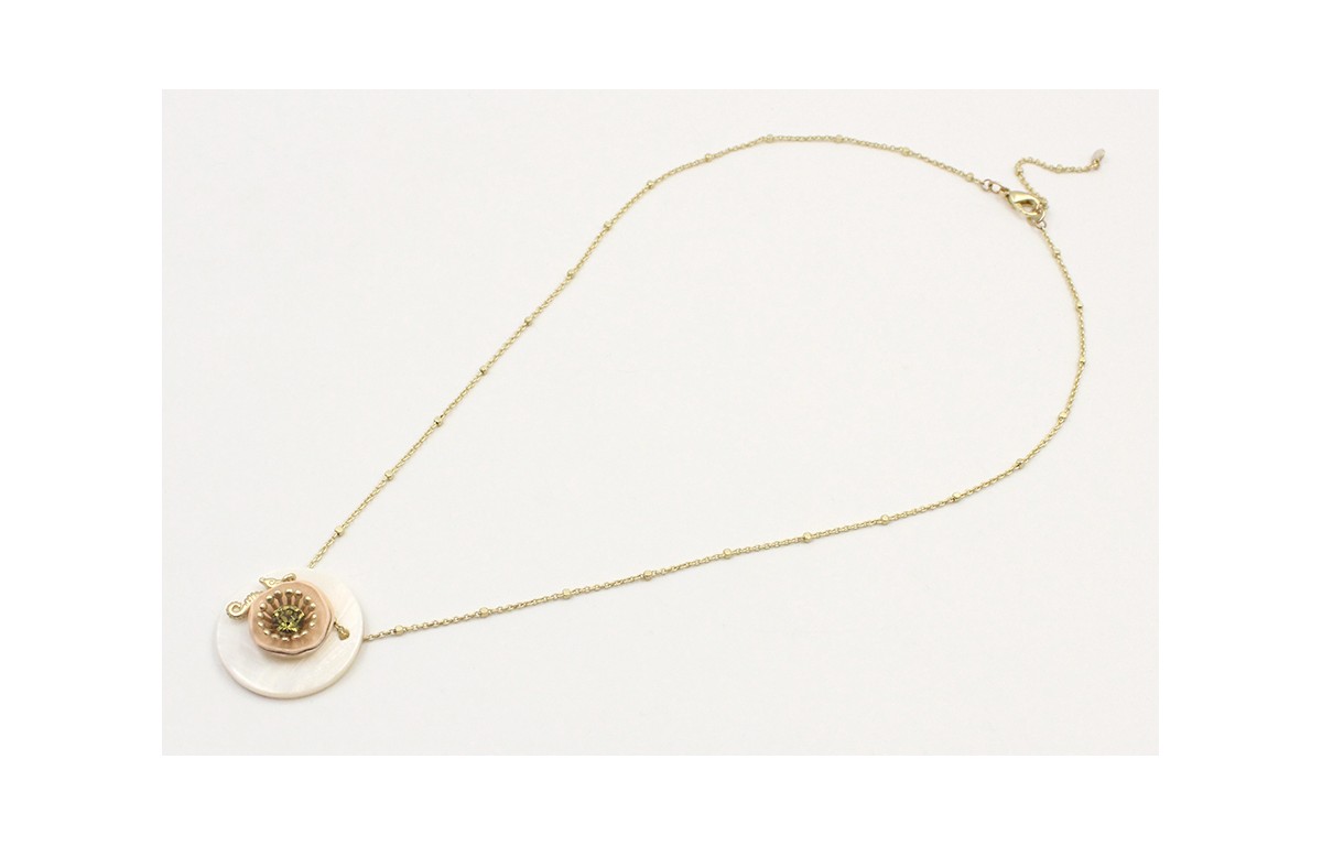 Collar cadena microbola oro mate con disco de nacar, caballito de mar y flor esmaltada salmón. Largo 44cm.