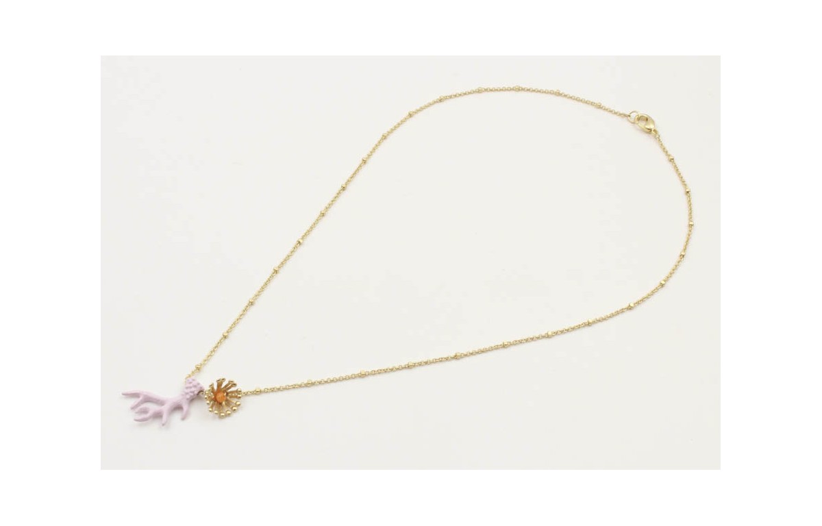 Solitario cadena microbola oro mate con rama de coral esmaltada lila y casquilla oro mate rematada bola coral. Largo 40cm.