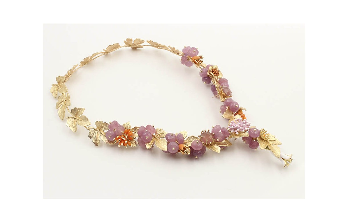 Collar hojas parra con burruños de bolas moradas, flores esmaltadas naranjas, flor campanilla blanca, uva coral, burruño corales. Largo 58cm.