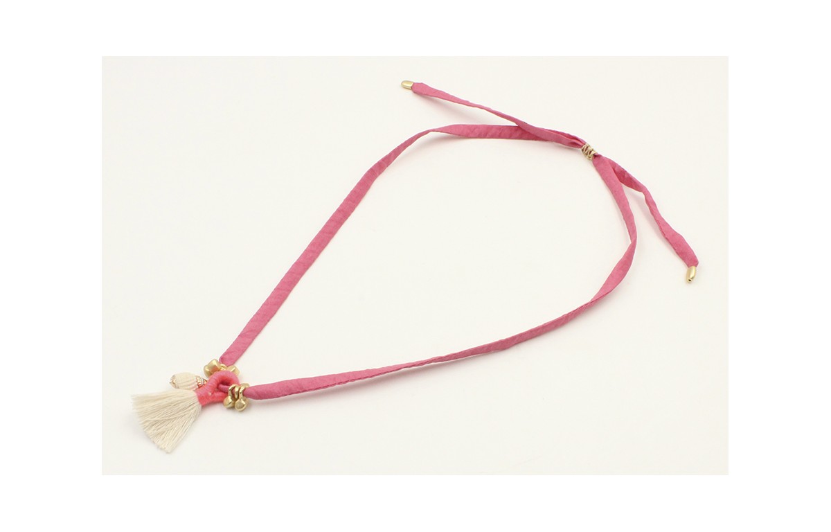 Collar seda color rosa fuerte con colgante caracola borde dorado, pompon blanco y fuxia, cubos oro mate. Es regulable.