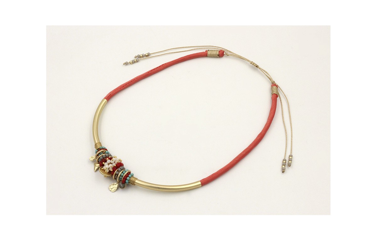 Collar seda rellena naranja tubo curvado curvado dorado mate y con colgantes diente tiburón, esmalte gris, laminas labradas y circulos de piedras, Cierre macrame dorado palido. Es regulable.