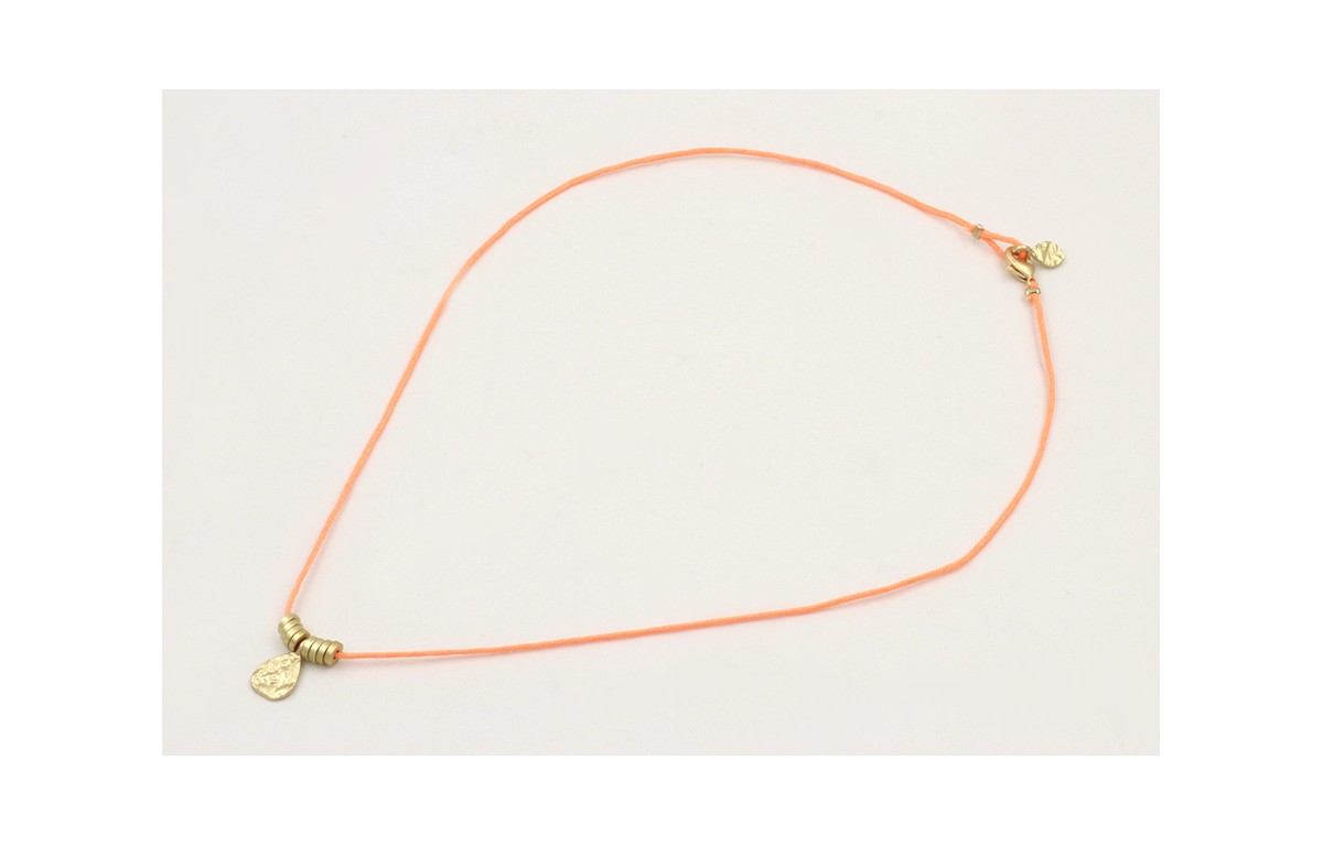 Collar hilo naranja fluor con colgante lamina labrada y ruedas doradas mate. Largo 38cm