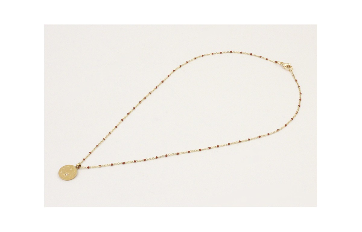 Solitario cadena acero inoxidable micro esmalte marrón con colgante planetas. Largo 38cm