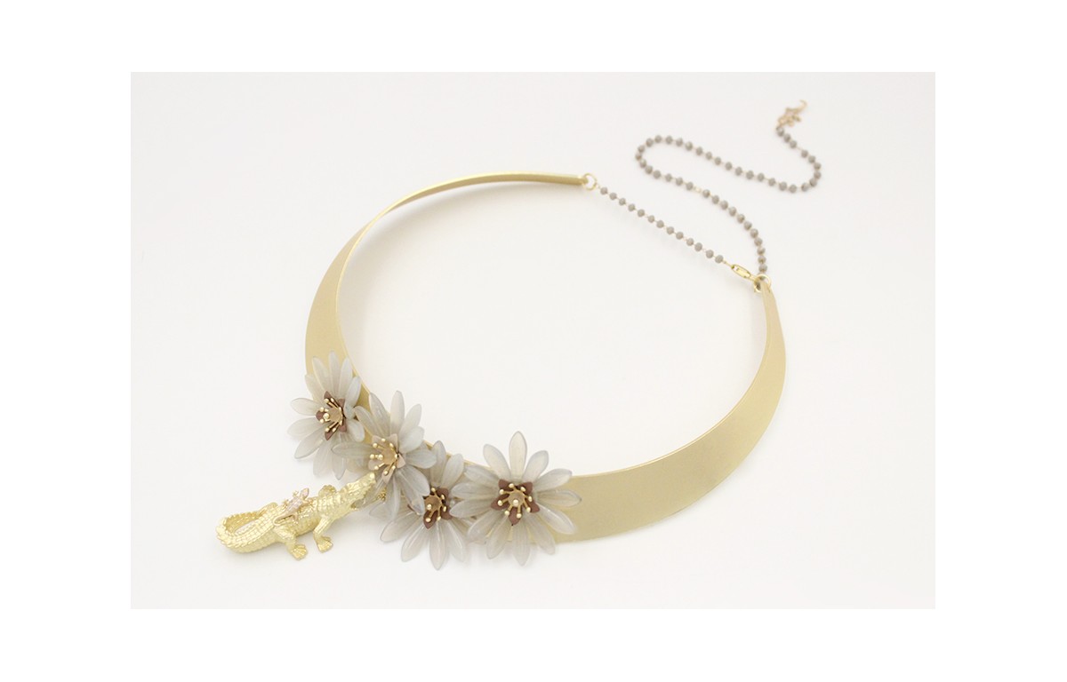 Collar rigido con flores de dagas grises,casquillas flor esmaltadas en marrón y visón con cocodrilo en oro mate y lagarto de brillos cristal rematado con cadena de facetadas grises.
