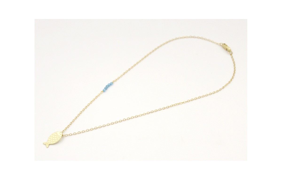 Solitario cadena eslabón pequeño en oro mate con semipreciosas azules y colgante pez oro mate. Largo 40cm.