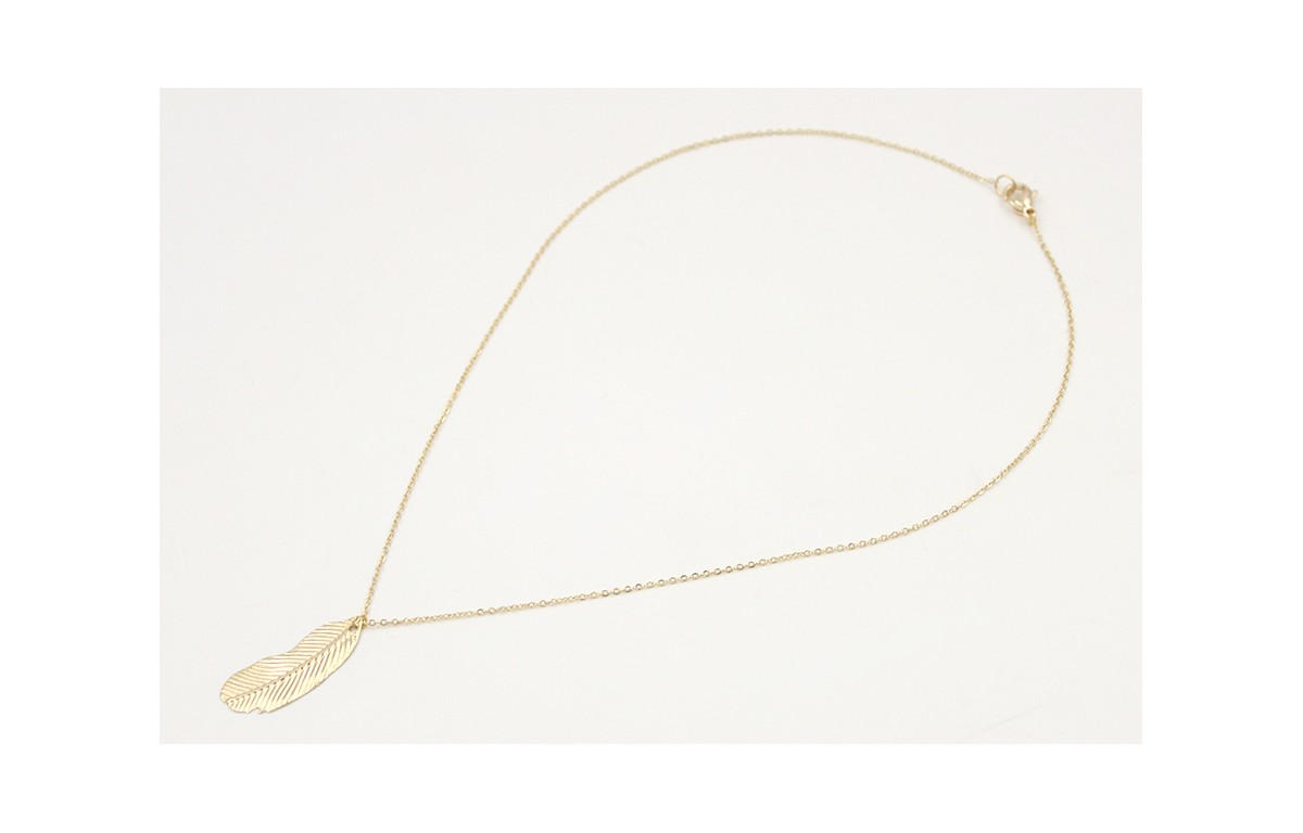 Solitario de cadena de acero inoxidable dorada con colgante pluma. Largo 40,5cm
