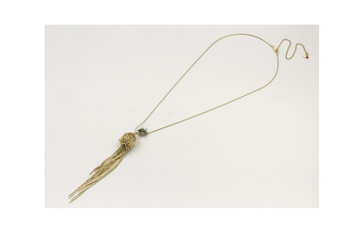 Collar cadena cordón dorado mate con medusa y burruño piedras turquesa. Largo 62cm.