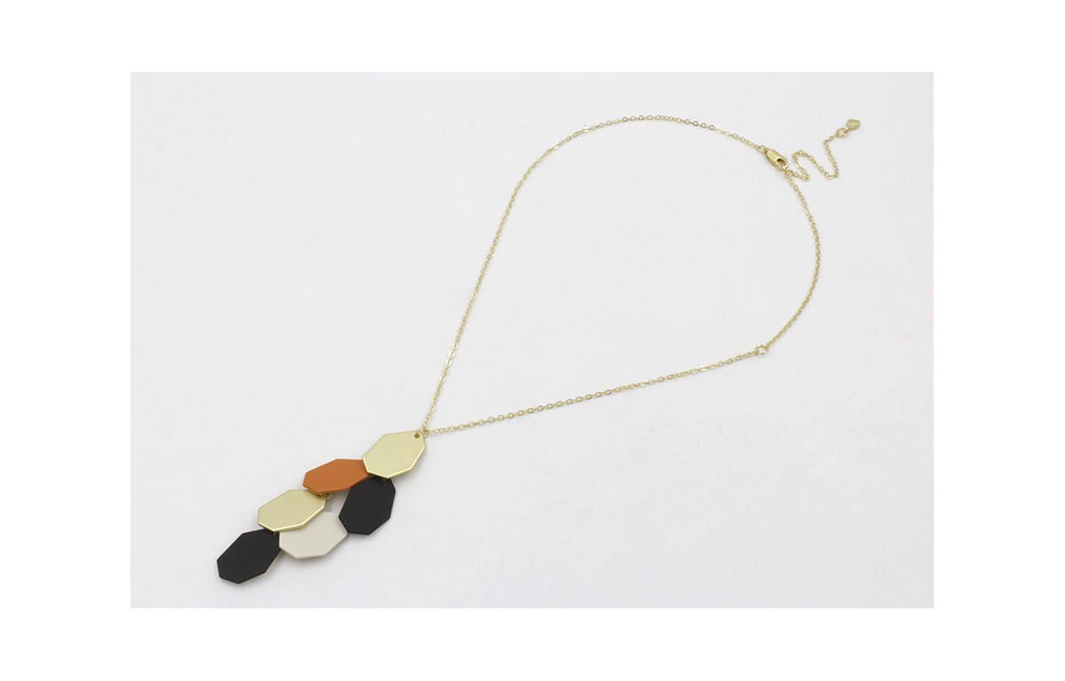 Collar cadena de eslabón doarado mate con hexágonos beige,teja,negro y dorado. Largo 41cm.