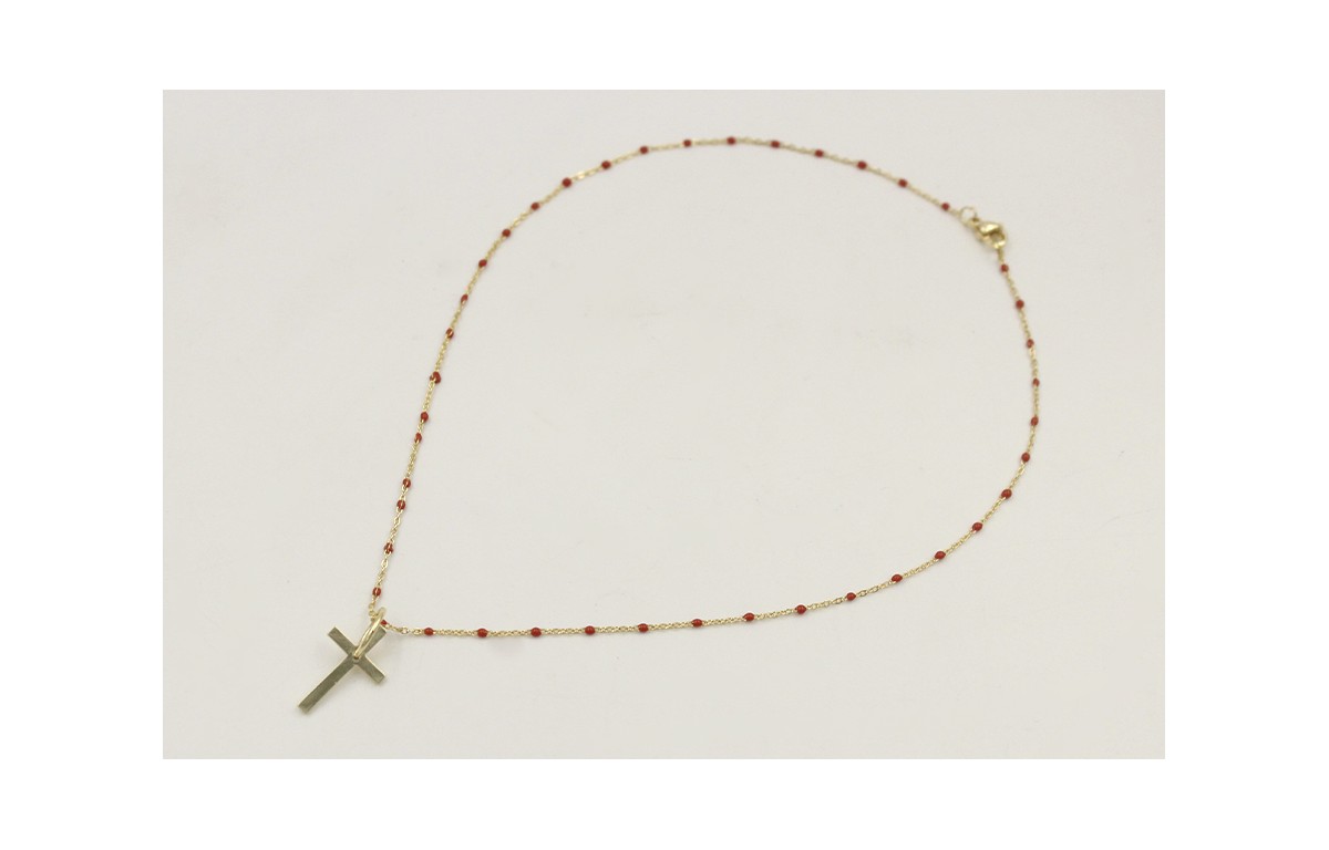 Solitario acero inoxidable cadena eslabón pequeño bolitas esmaltadas marrón con colgante cruz grande con aro. Largo 40cm.