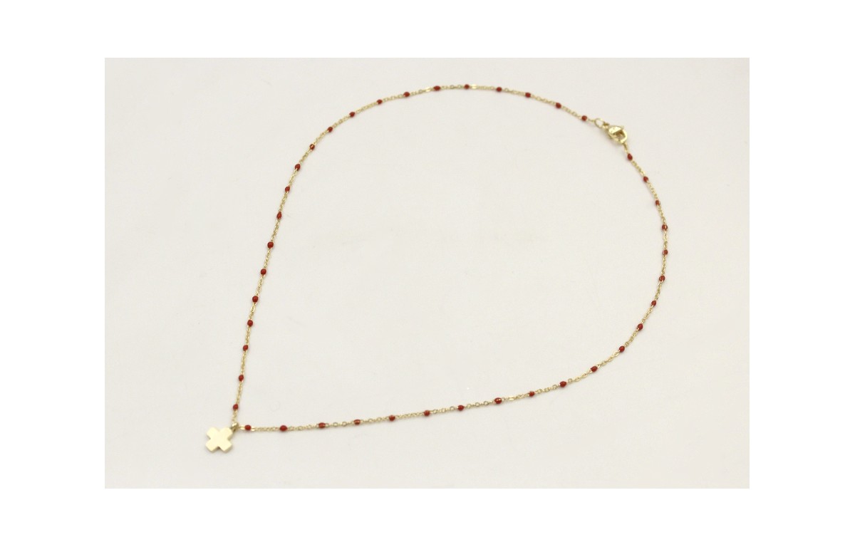 Solitario acero inoxidable cadena eslabón pequeño bolitas esmaltadas marrón con colgante cruz pequeña. Largo 40cm.