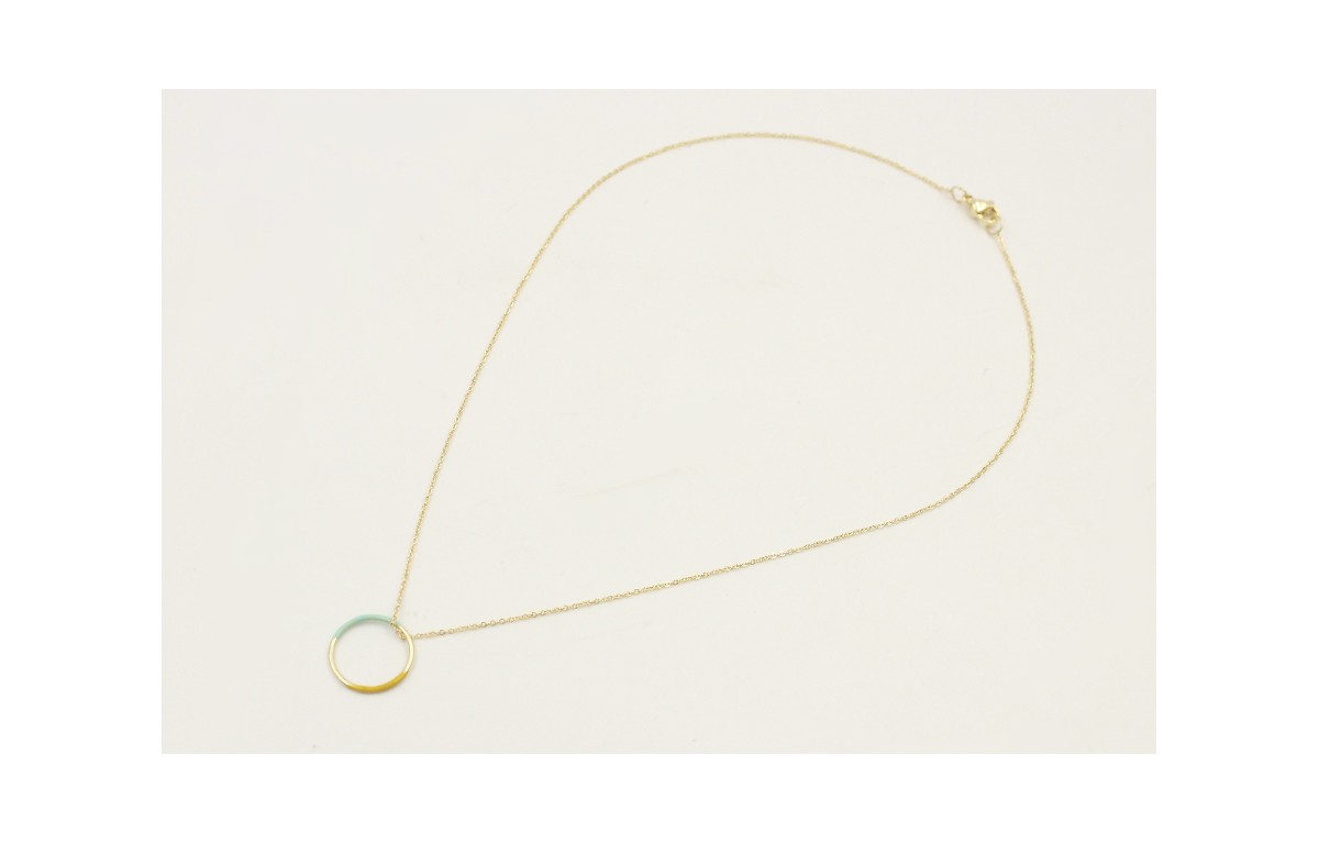 Solitario de acero inoxidable con cadena de eslabón pequeño y aro esmaltado turquesa y mostaza. Largo 40cm.