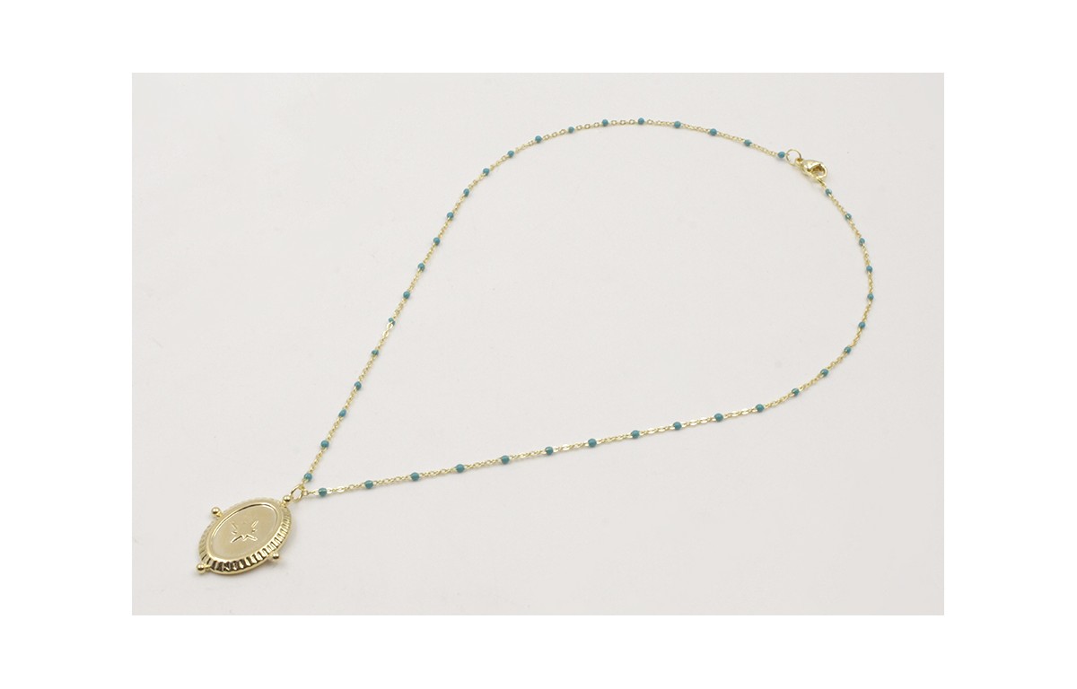 Solitario acero inoxidable cadena eslabón pequeño bolitas esmaltadas azul con colgante ovalado estrella. Largo 40cm.