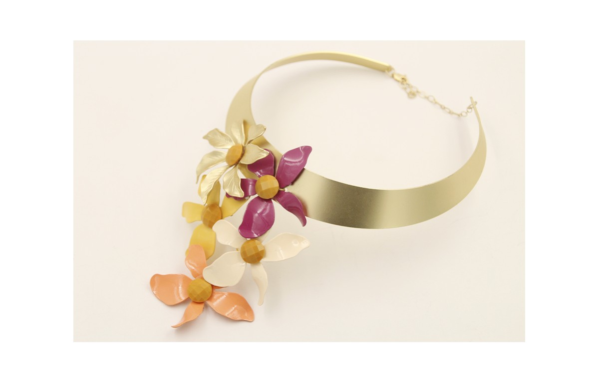 Colla lámina rigido con flores 5 pétalos esmaltadas rosa,beige,cardenal,amarilla y flor 7 pétalos dorada mate, rematada con cadena alargadora. Es regulable