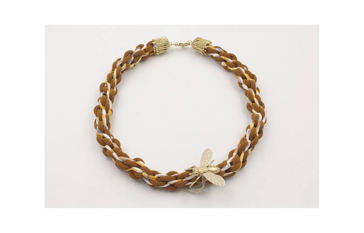 Collar cordón trenzado marrón y liberty con flores en tonos amarillos con nudo kumihimo y cierre de gancho de oro mate. Largo 46cm.