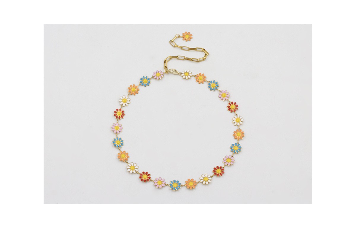 Collar acero inoxidable cadena de margaritas esmaltadas multicolores rematda con cadena de eslabón rectangular y margarita. Es regulable