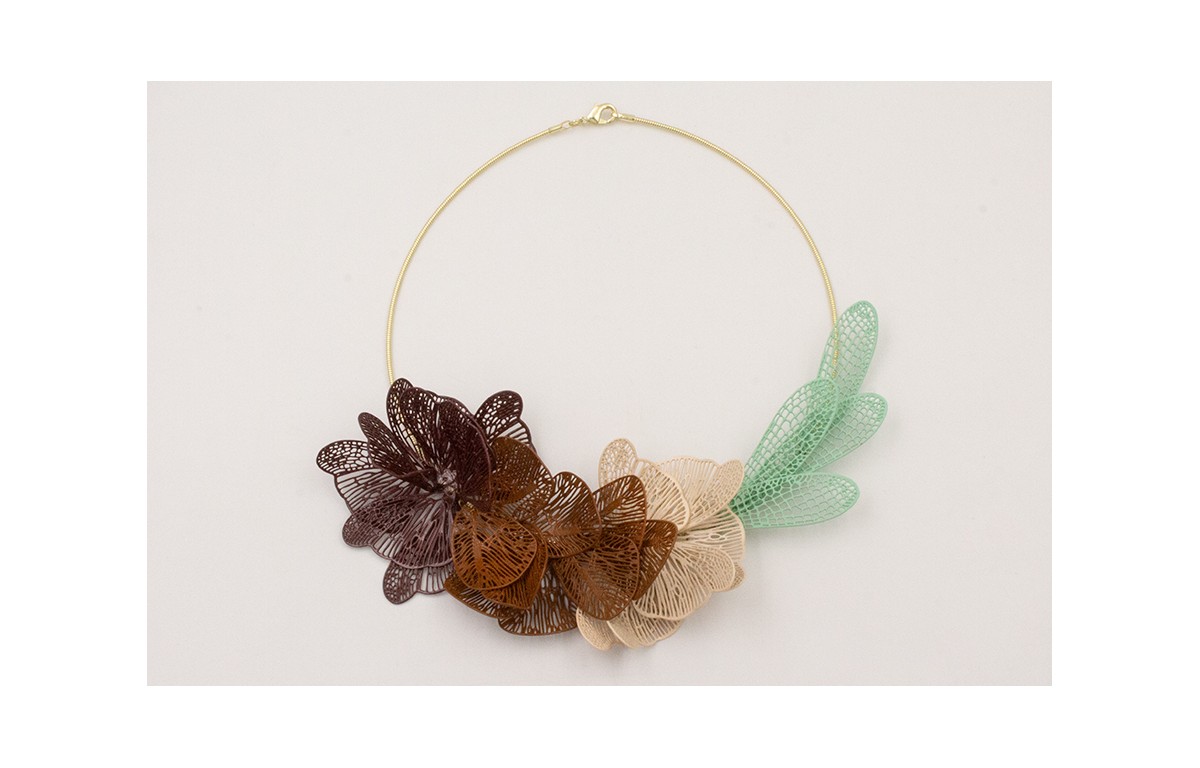 Collar rigido con alas de mariposa esmalte marrones haciendo flor y alas redondeadas esmalte marrones, alas libélula esmalte turquesas.