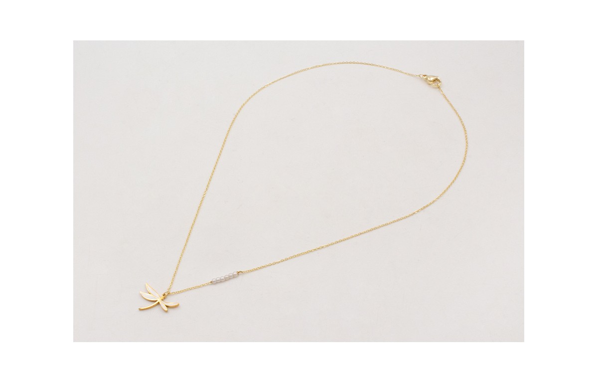 Collar solitario de ACERO con libelula esmaltada blanca y microperla cosida en la cadena