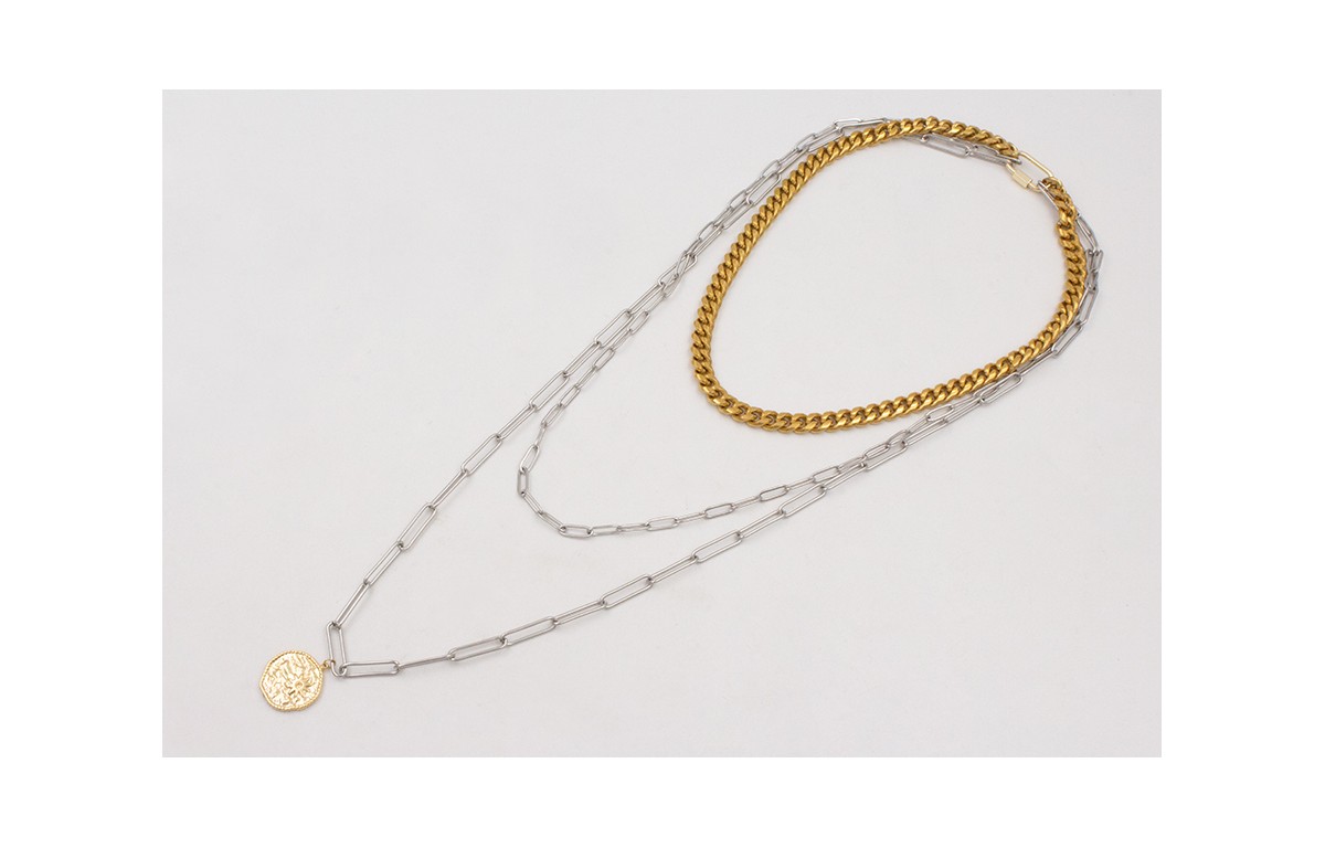 Collar triple ACERO con cadena corta dorada eslabones plana,cadena plateada eslabones pequeños,cadena plateada eslabones alargados y chapa dorada dibujo sol