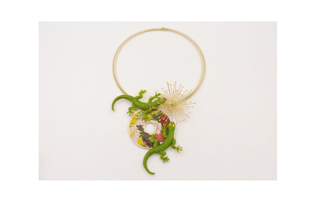 Collar rigido lámina dorado mate con largartos esmaltados verdes, disco flores amarillas y rojas,soles destelleantes y cabujón cristal verde opal.