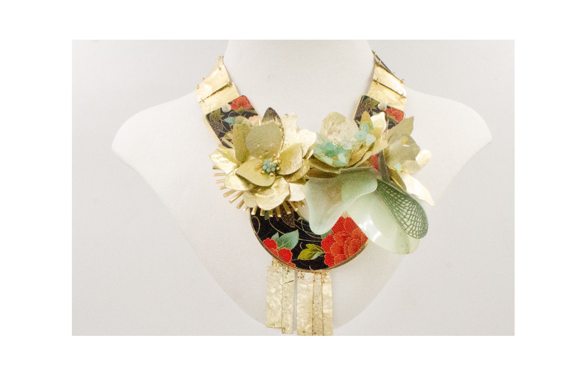 Collar lentejuelas cuadradas doradas con centro diaco flores rosas,blancas y negras,flores lentejuelas doradas,rama chip