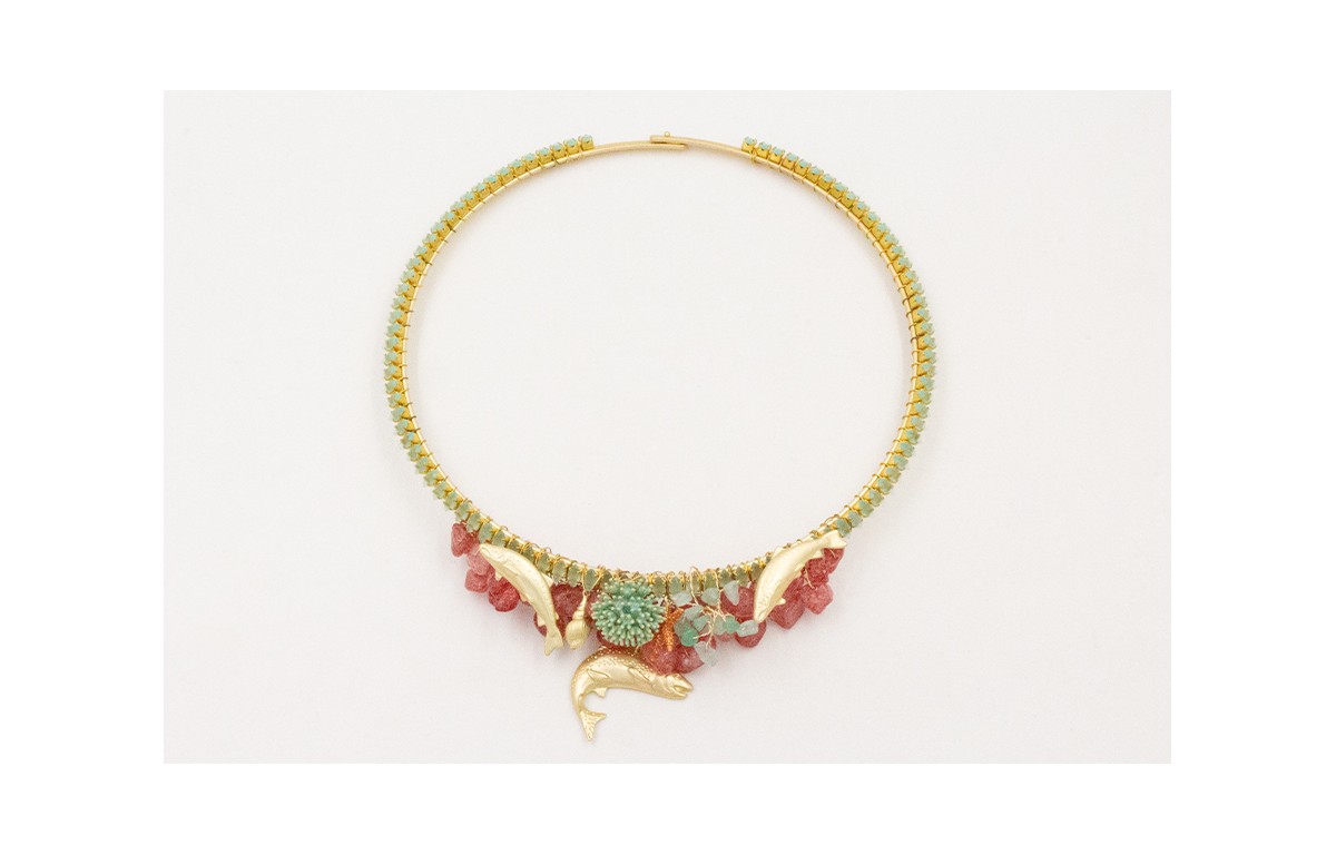 Collar lámina dorado mate con cadena strass cristal verde vidrio cosida centro peces dorados mate,nenufar esmlatado turquesa,estrella marrón y rama chips jade.