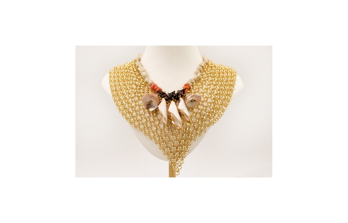 Collar malla pico con colgante scaracolas bordes dorados,chips coral marrón, disco coral y minis caracolas.
