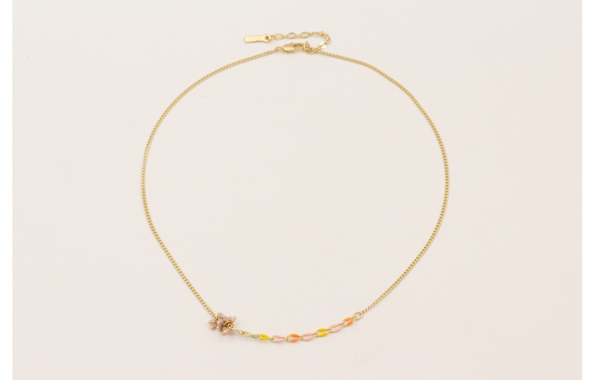 Collar cadena eslabón plano dorada mate con centro cadena eslabones esmaltados colorines y burruño miyuki lila.