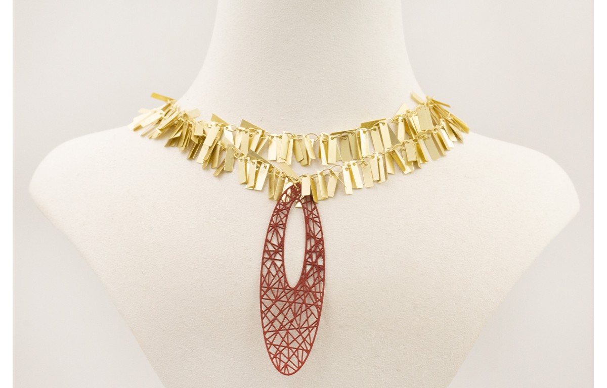 Collar doble cadena rectangulos colgando dorado mate con colgante ovalo grande labrado color teja.