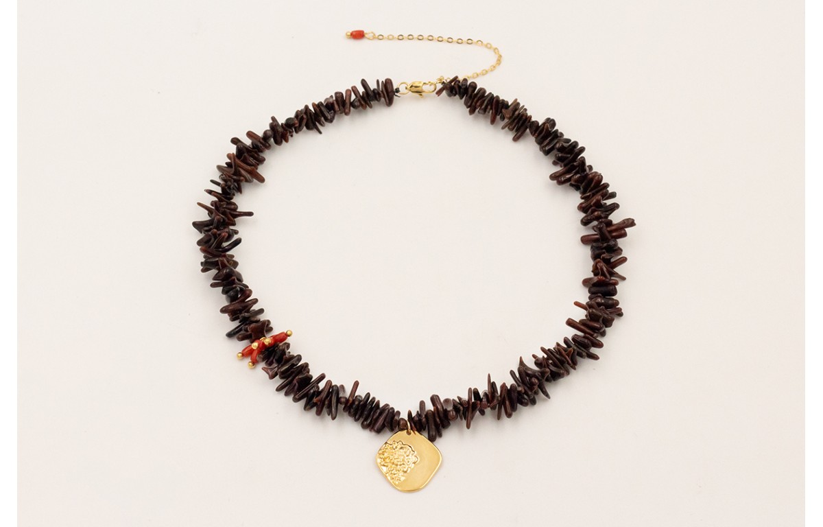 Collar chips coral marrones con burruño micro tubo coral colgante rombo flor, cierre y cadena eslabón pequeño todo baño ORO18K-3micras.