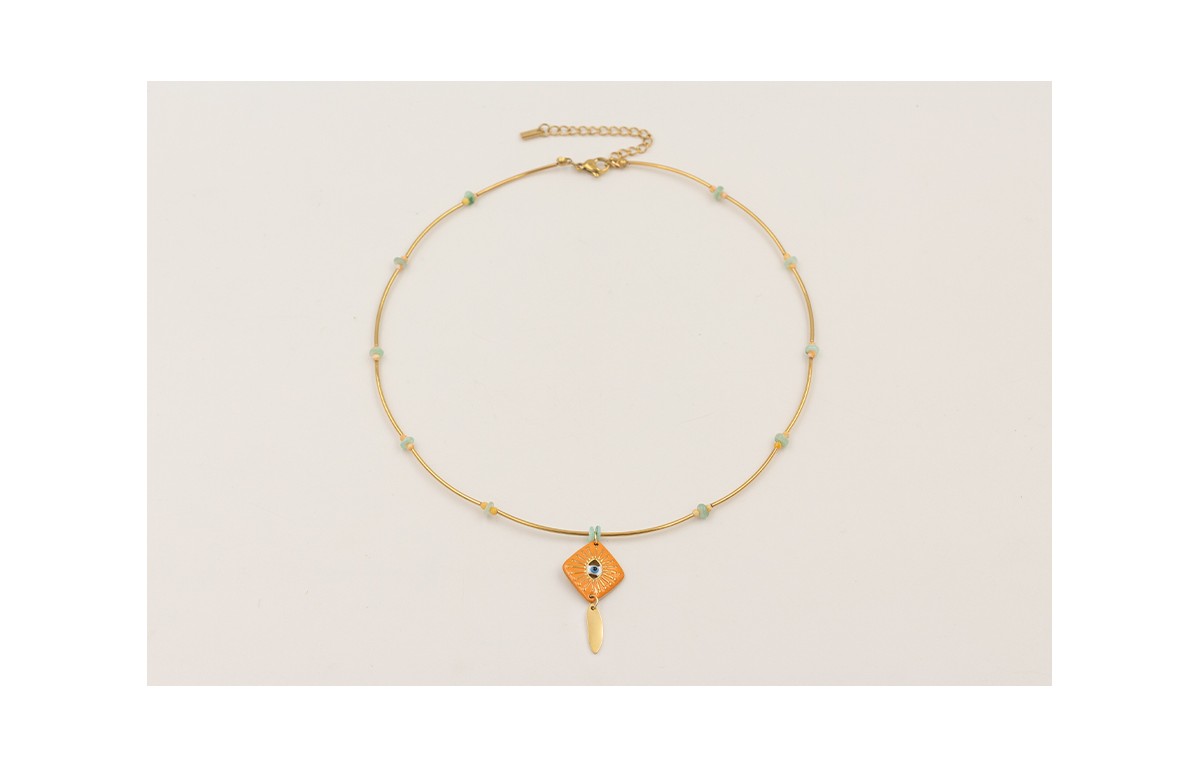 Collar acero inoxidable con tubitos, discos coral color turquesa, bolita facetadas rosada, colgante rombo ojo turco esmaltado naranja t gota oro, rematado con cadena alargadora.