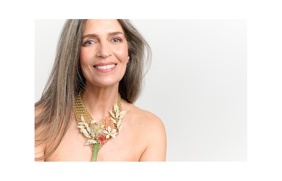 Collar malla en pico dorado mate con ramas miyuki beige, flor 3 capas, escarabajo coral y lila, flor esmaltada coral, escarabajo lima y fleco strass verde.