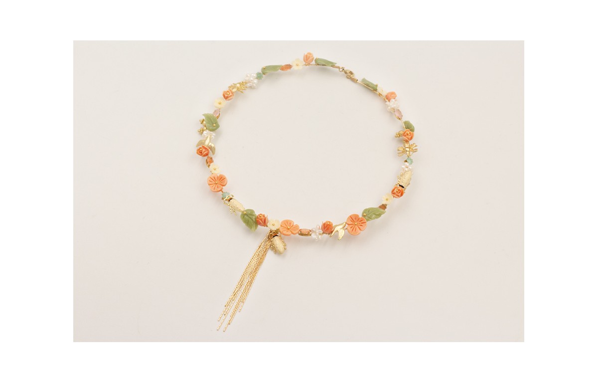 Collar rigido con flores de resina de coral, bolitas perlas, escarabajo beige, golondrina, abaeja, cabujones de cristal y fleco dorado mate.