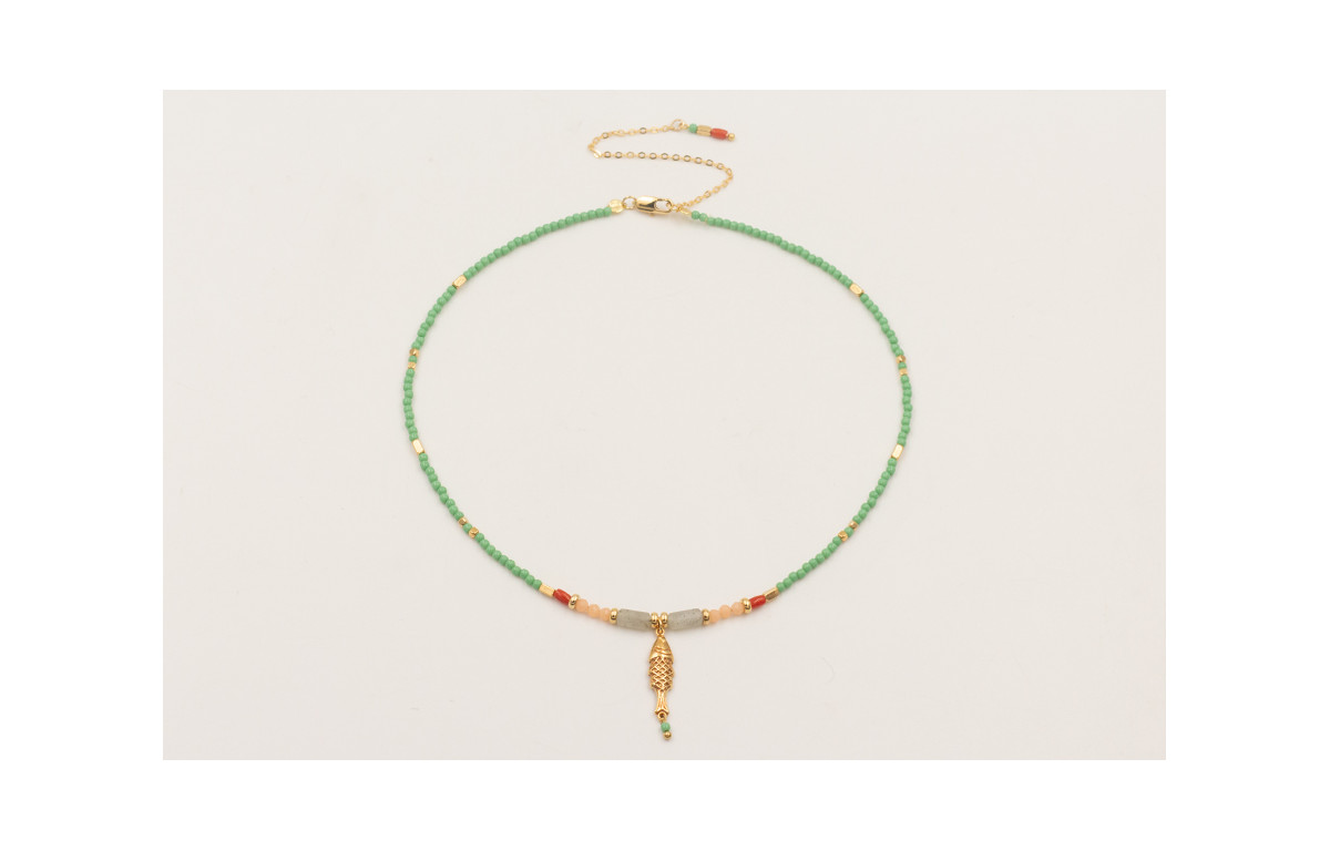 Collar ORO18K con bolas piedra verde opaco,colgante pez, entrepiezas cubos, rectangulos, discos, facetadas melocotón, tubito coral y piedra gris.