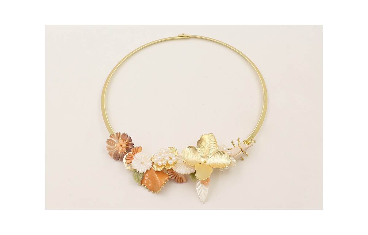 Collar lámina rígida dorada mate con flores de nacar blancas,cobre, escarabajo esmaltado beige, hoja resina de coral color verde,ramas de perlas, flor grande dorada mate.