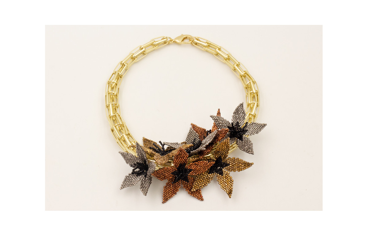 Collar completo piezas tubulares dorado mate con flores de miyuki color plata, cobre y bronce.