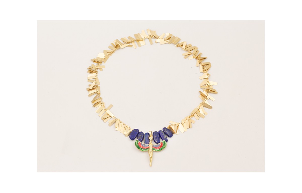 Collar cadena listones dorados mate con gotas lapíslazuli y colgante egipcio esmalte tricolor.