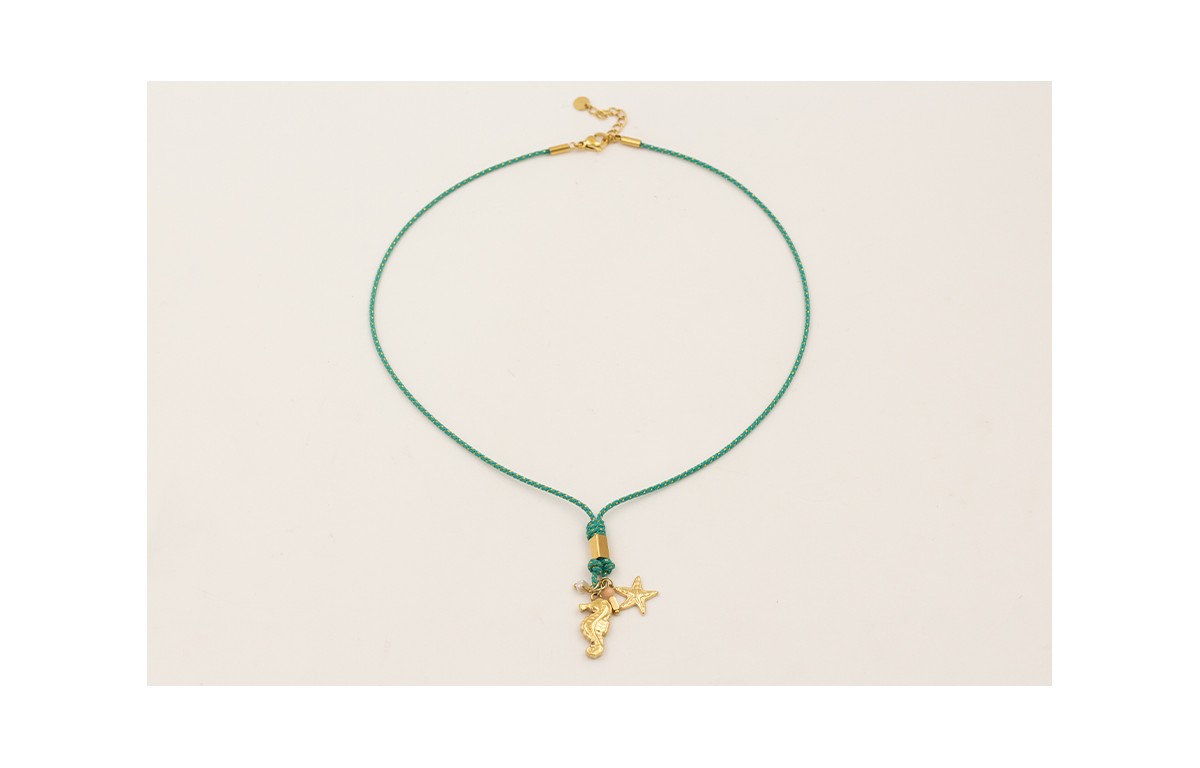 Collar cordón hilo dorado color turquesa con colgantes ACERO INOXIDABLE caballito mar, estrella, chips perla natural.