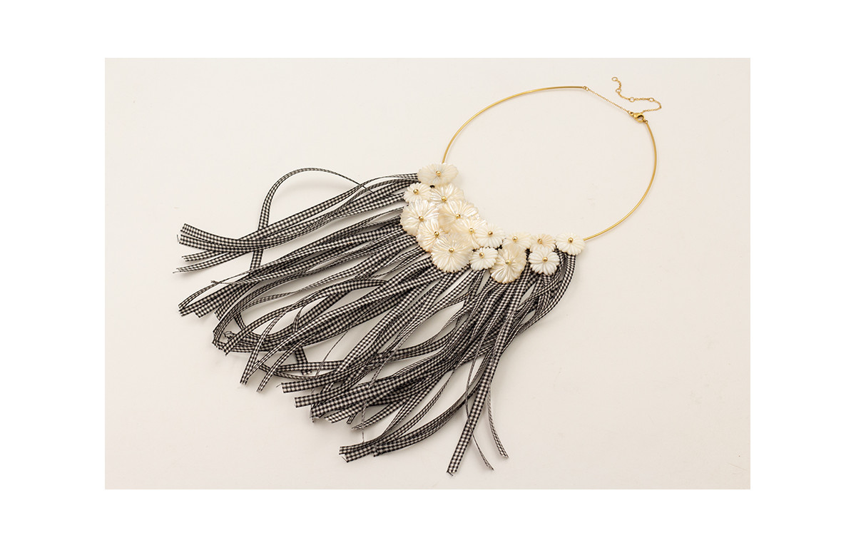 Collar rigído ACERO INOXIDABLE con flecos lazo vichy cuadros negros, flors redondas nacar.