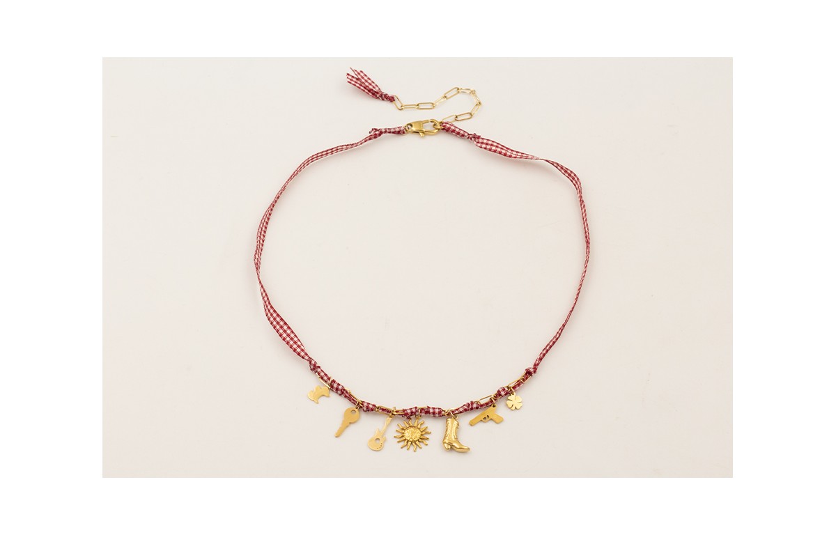 Collar ACERO INOXIDABLE varios colgante perro, llave, guitarra, sol, bota cantera,pistola y trebol con lazo vichy cuadro burdeos y cadena eslabón rectangular pequeño.