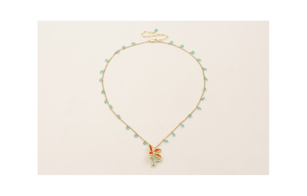 Collar cadena cristales turquesas con colgante flores esmaltadas turquesa y teja.