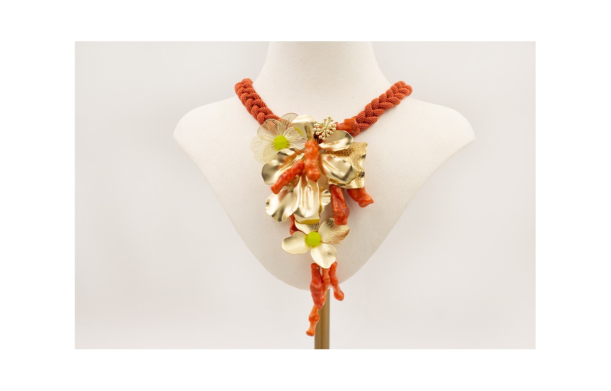 Collar cordón color oxido trenzado con flores doradas mate en cascada, tallos coral, discos facetados jade verde.