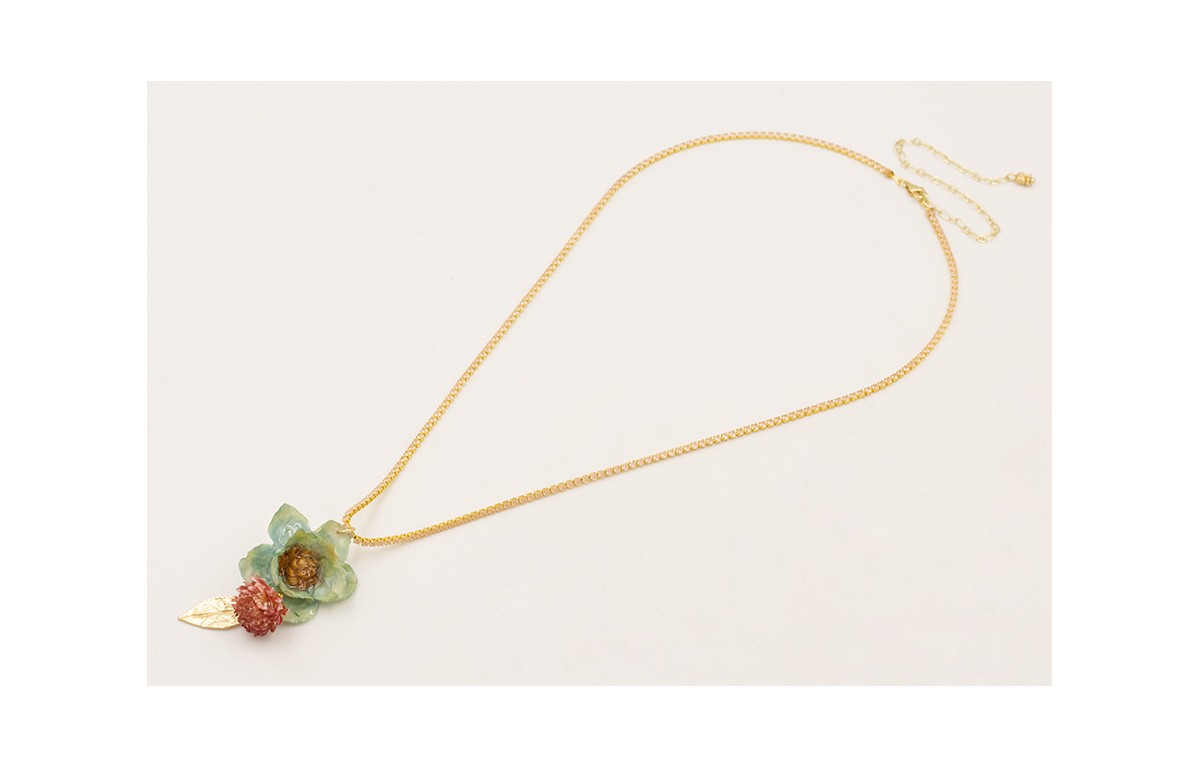 Collar cadena strass rosa opal con flor natural resina azul, capullito flor nautral malva y hoja dorada mate.