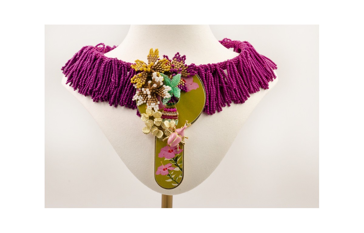Collar lamina forrada de abalorio purpura con colgante disco y pieza estampadas floes lilas, escarabjo rosa, flores miyuki lima, purpura, blanca, turquesa.