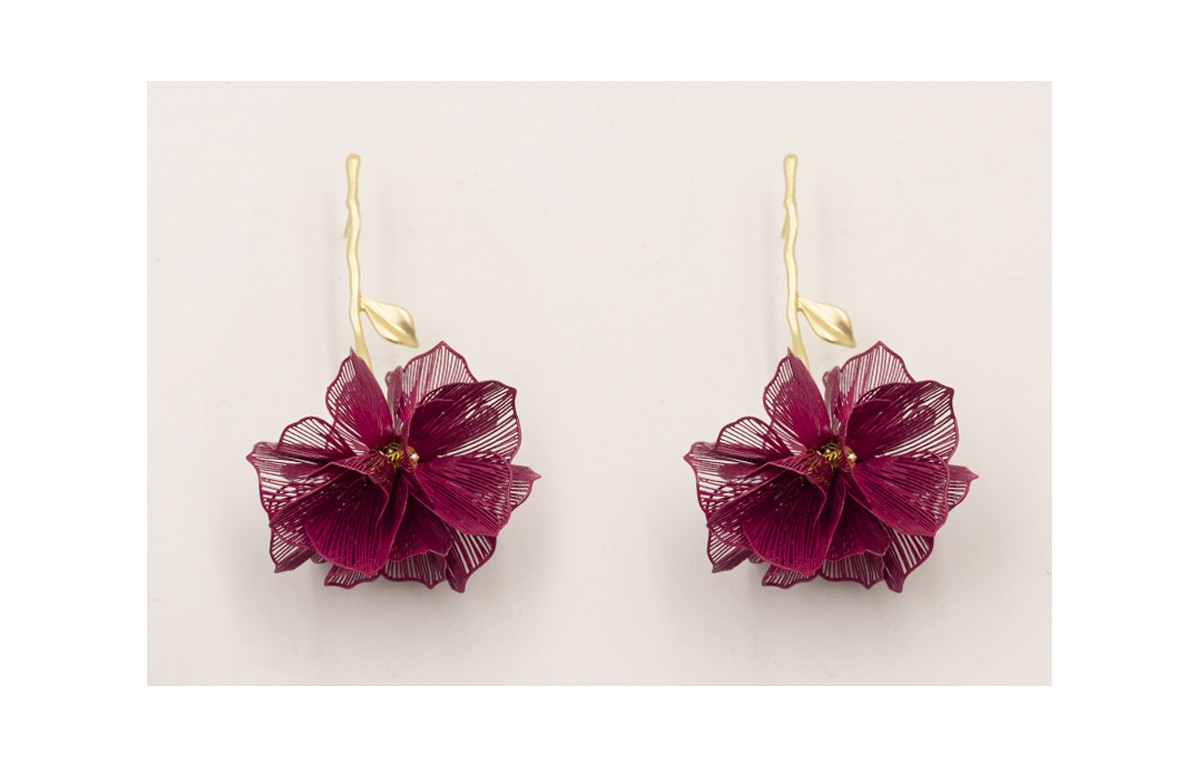 Pendientes rama con hoja dorada mate y bola de casquillas flores esmaltadas color cardenal.